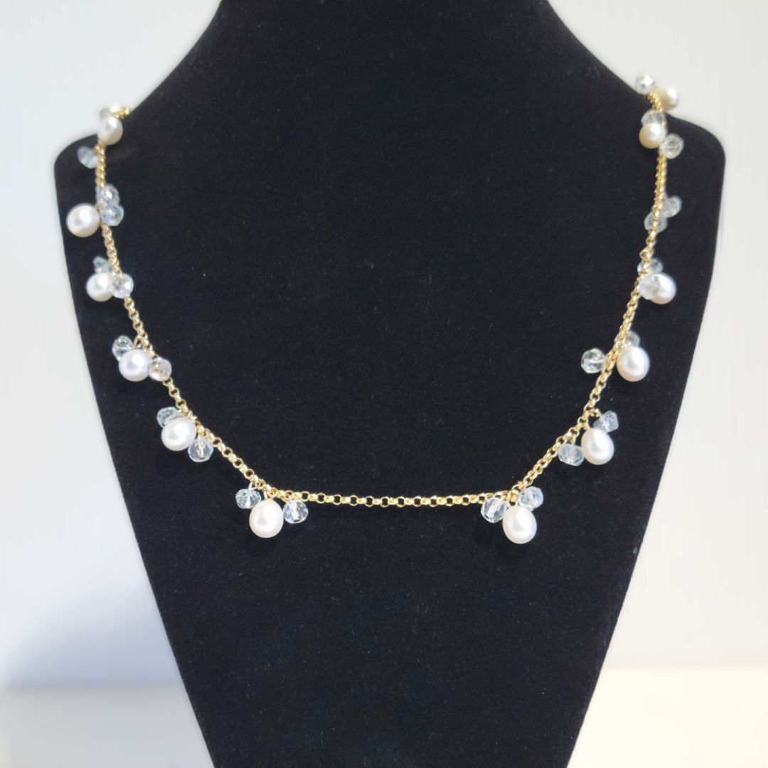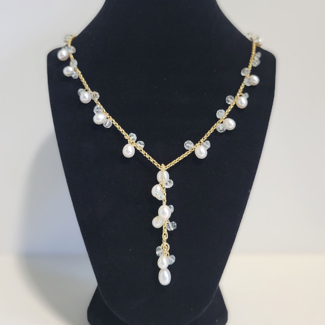 Collier de perles avec or 14 carats d’une longueur de 18 pouces avec une rallonge de 4″ si désirée. Ce qui vous fais un collier de 18 pouces ou un collier de 22 pouces ou un collier de 18 pouces avec un pendentif. Parfais pour agencer avec des ensembles différents de vêtements.