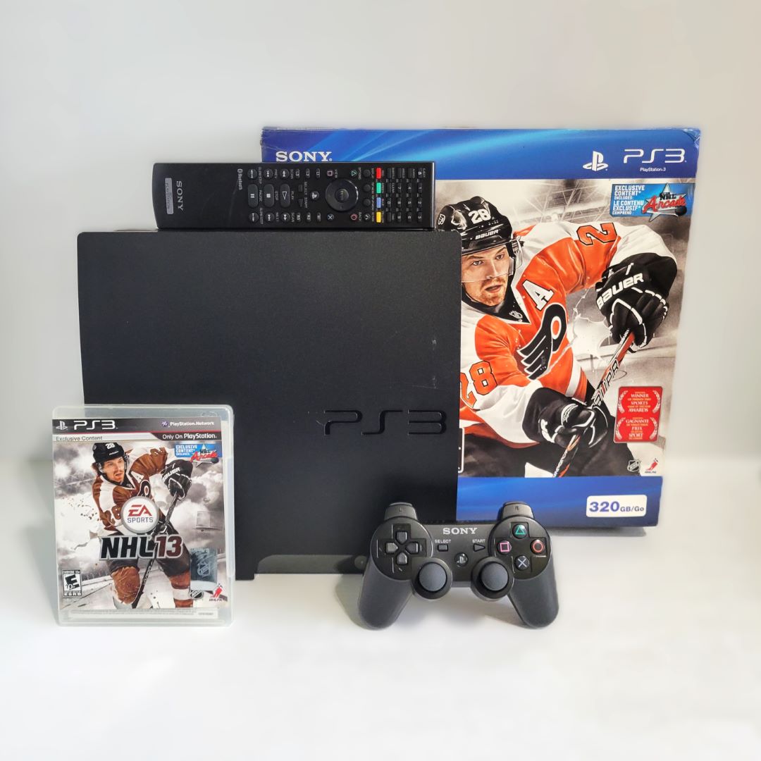 L’ensemble comprend la console playstation 3 avec son adaptateur, une manette avec son fil de charge, le jeu NHL13, une télécommande playstation et un fil HDMI