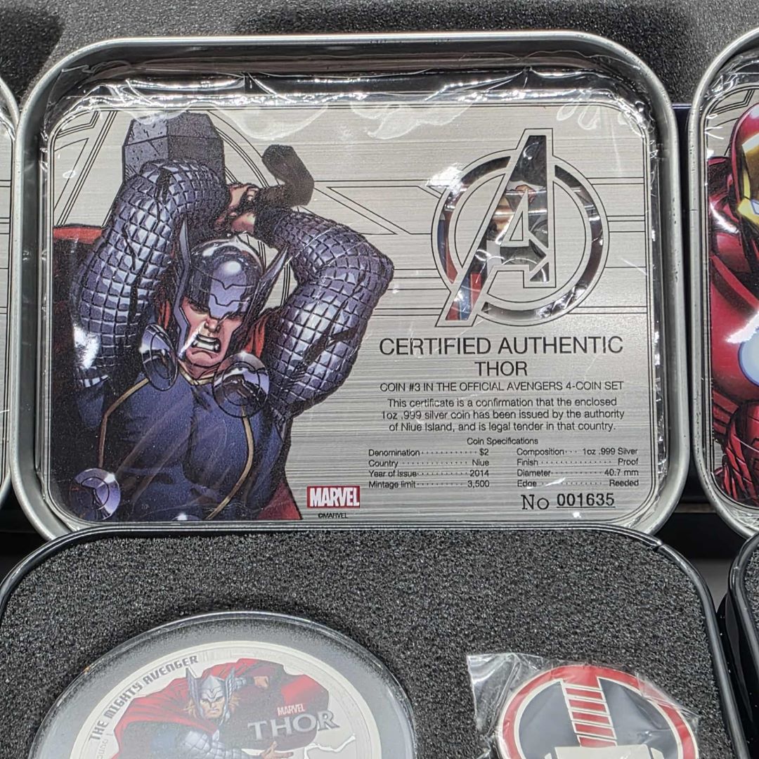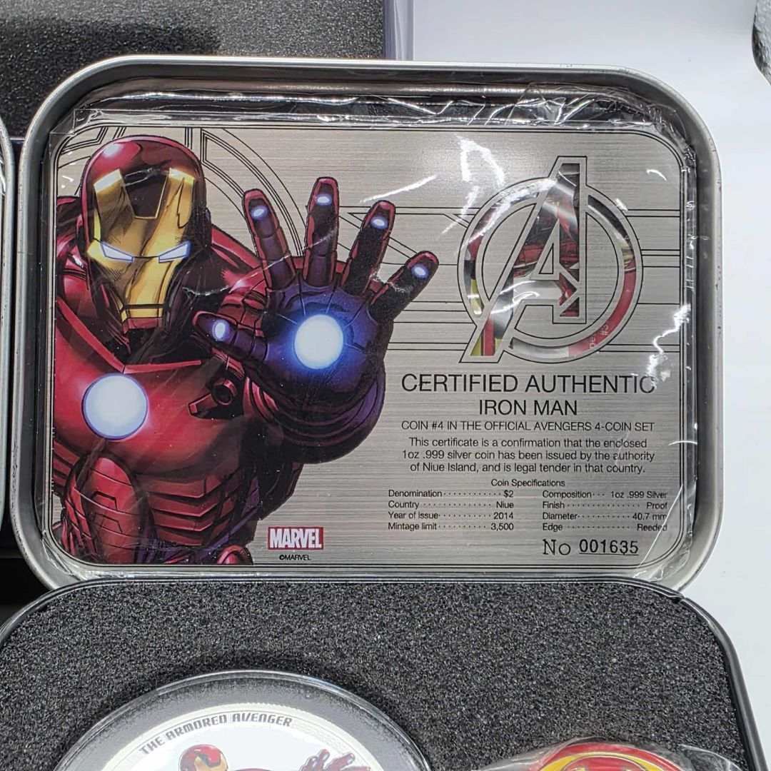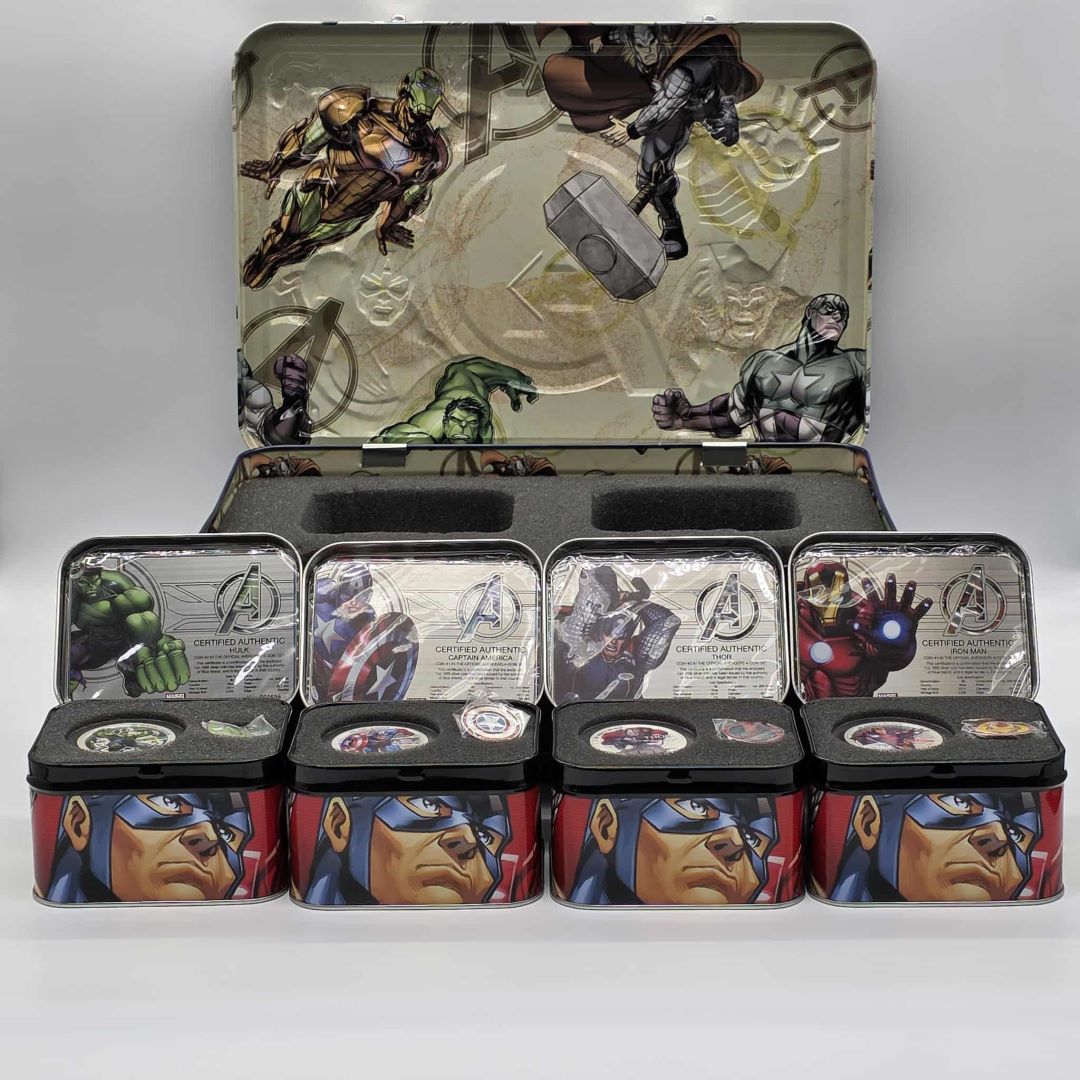 ENSEMBLE DE 4 PIÈCES DE 2$ EN ARGENT MONNAIE ROYALE CANADIENNE THE AVENGERS (IRON MAN, CAPTAIN AMERICA, THOR, HULK)