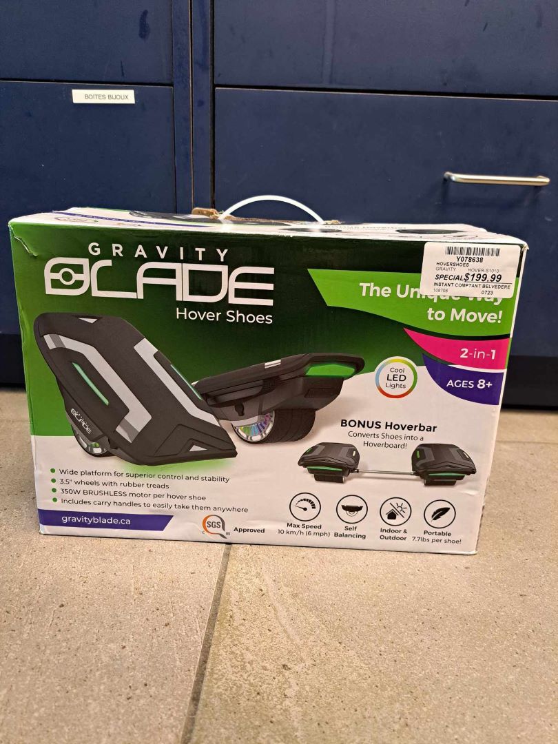 Ces chaussures uniques seront à coup sûr votre nouveau moyen de transport préféré. Sûrs et confortables, ils peuvent être utilisés sur presque toutes les surfaces et vous permettent de rouler à l’intérieur comme à l’extérieur. Totalement auto-équilibrés pour limiter les chutes et les glissades possibles, ils disposent même de lumières LED froides pour la conduite nocturne. Les chaussures extra-larges permettent un maximum de confort ainsi que de stabilité et de contrôle. Il y a même des poignées de transport intégrées pour que vous puissiez facilement transporter vos Hover Shoes n’importe où ! Essayez une paire pour la taille et impressionnez vos amis et votre famille avec votre choix de chaussures, tout en faisant de l’exercice et en vous amusant. Conçu pour les cyclistes âgés de 8 ans et plus, chaque ensemble comprend une paire de chaussures Gravity Blade Hover. Vous obtiendrez également un Hoverbar, qui est une barre en métal avec tout le matériel nécessaire pour convertir les chaussures en un hoverboard impressionnant qui reste stable pendant que vous glissez. Chaque boîte est également livrée avec un adaptateur de charge et un manuel d’instructions.