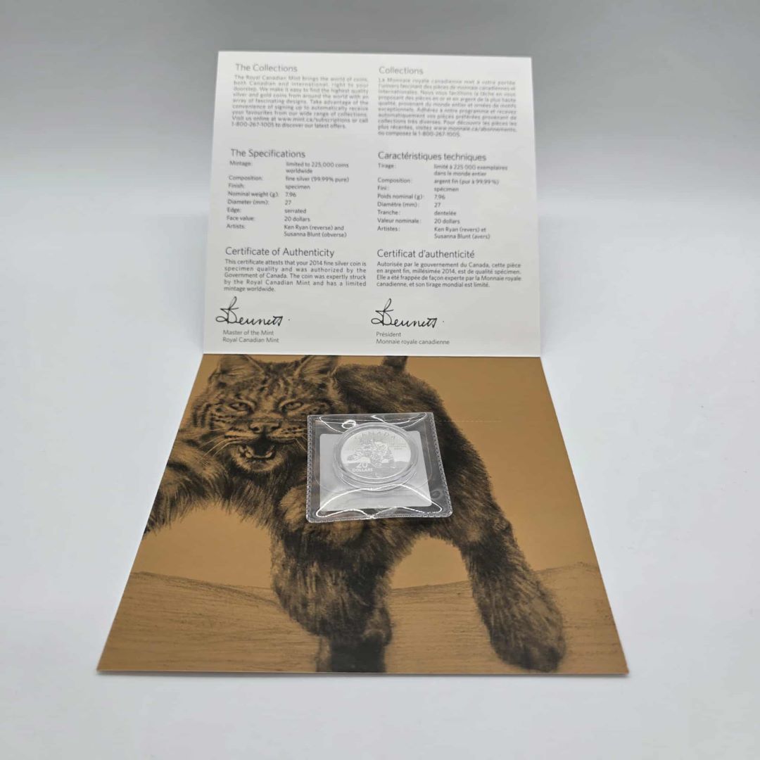 PIECES DE MONNAIE DE 20$ ARGENT 99.99% MONNAIE ROYALE CANADIENNE LE LYNX ROUX 2014