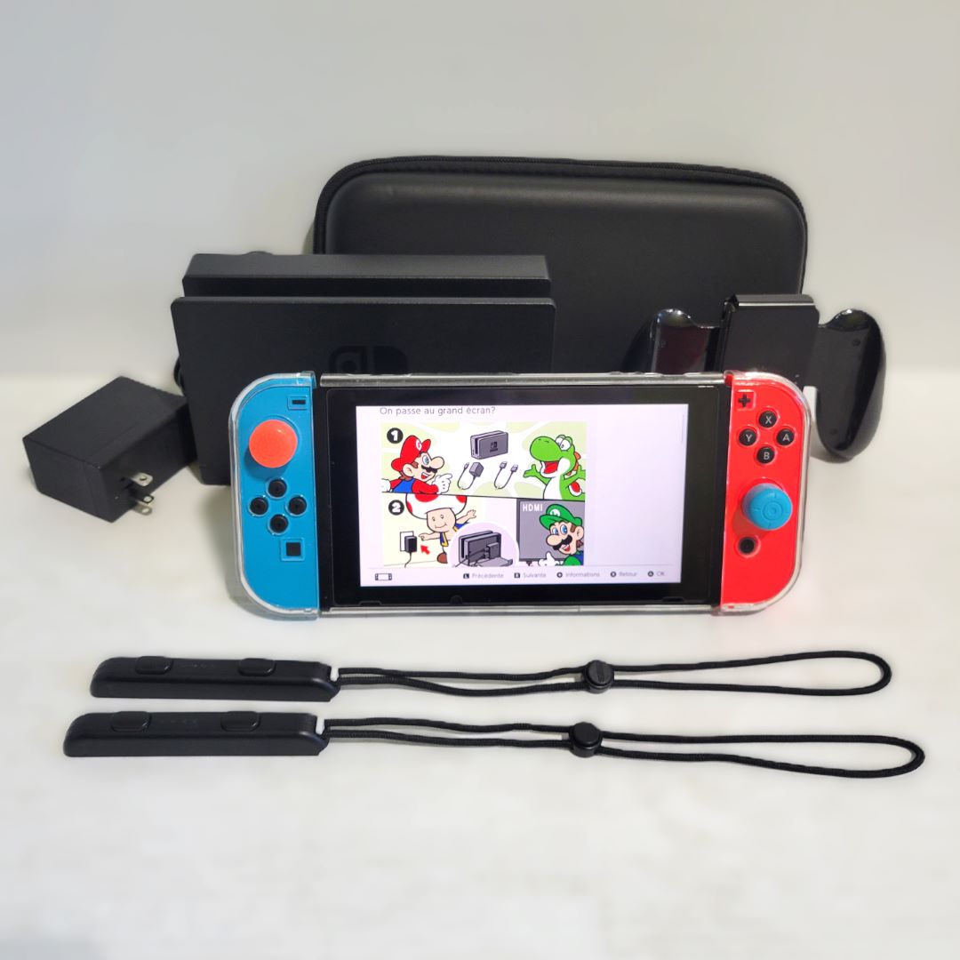 L’ensemble comprend la Switch et son adaptateur, les joycons, les dragones, le dock, le comfort grip, le case de transport ainsi qu’un fil HDMI
